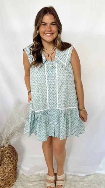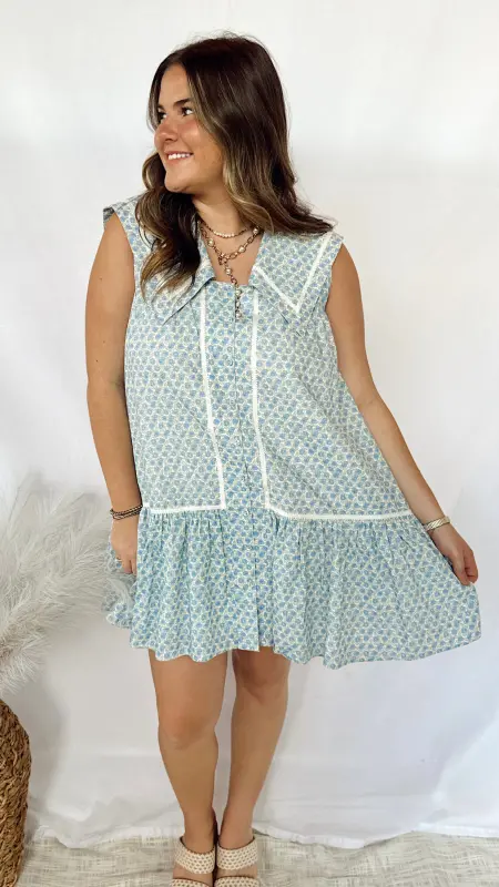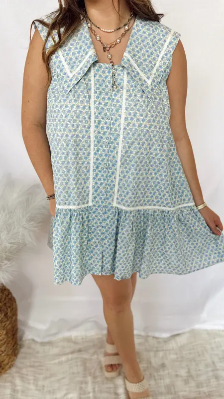 The Amelia Dress is a charming blue floral dress featuring a classic collar for a fresh, playful look. Perfect for sunny days or casual outings, its light fabric and cheerful pattern make it easy to wear and style.
