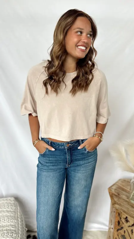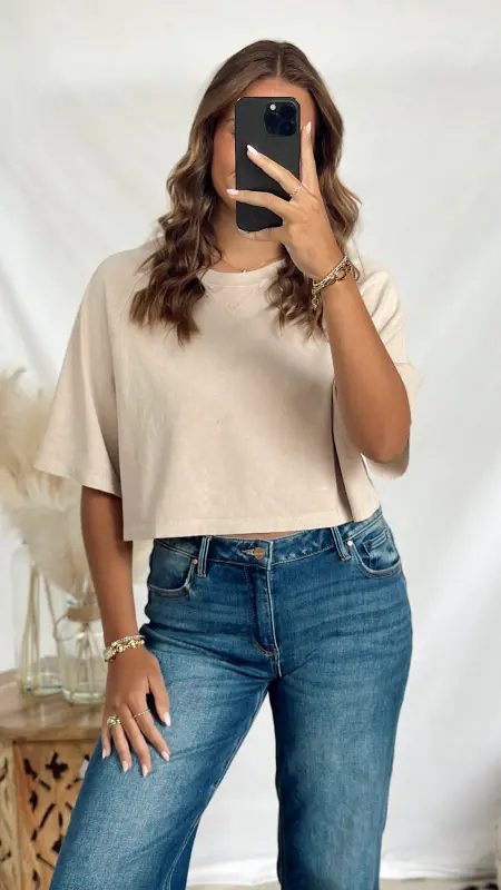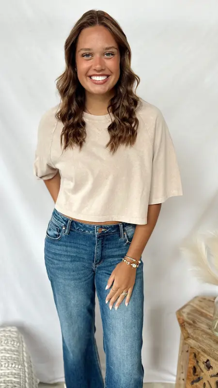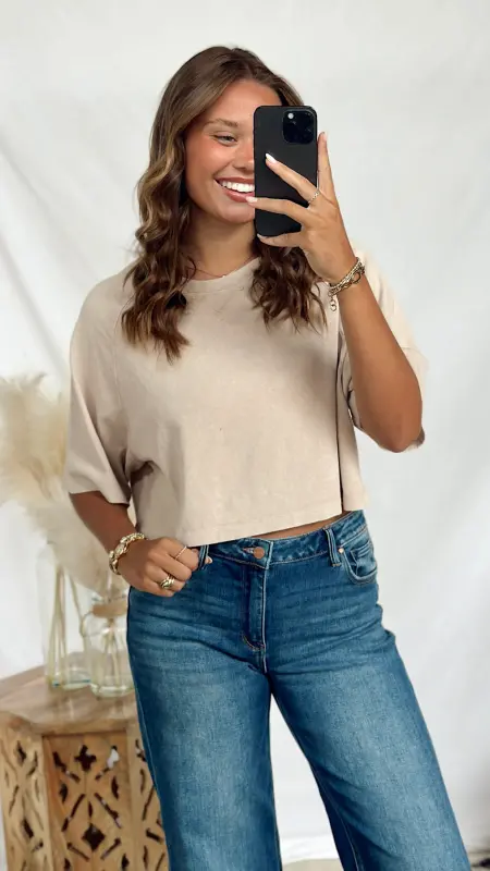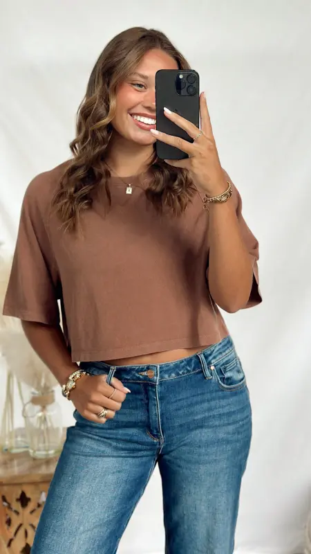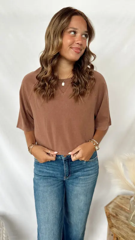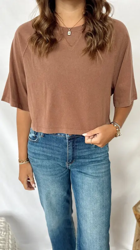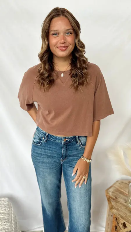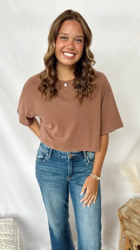 The Autumn Tee is a fun, cropped short sleeve tee perfect for layering or wearing on its own. Available in cozy brown and soft taupe, it adds a touch of seasonal style to any casual outfit.