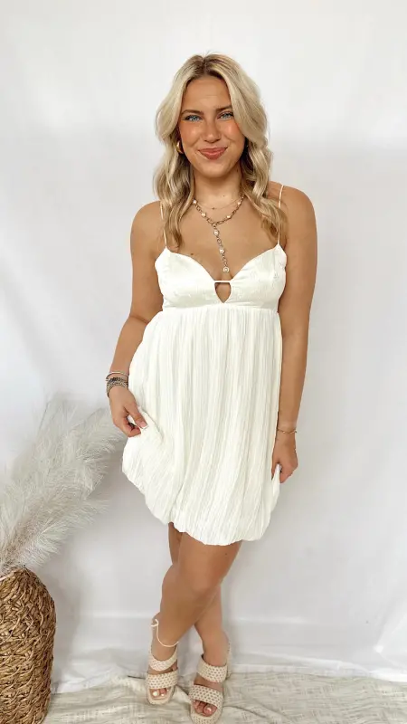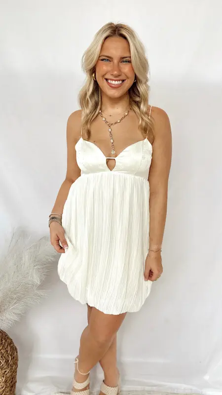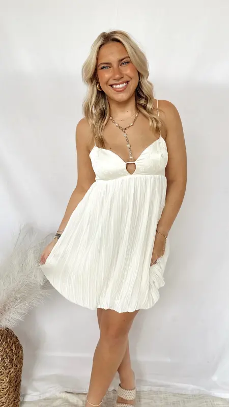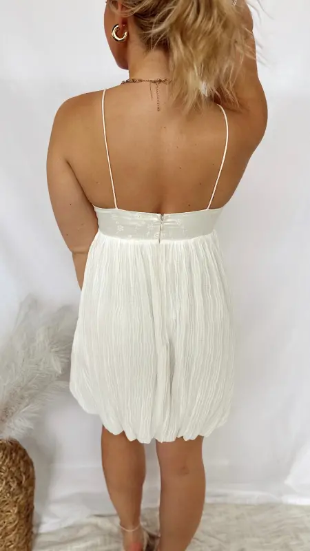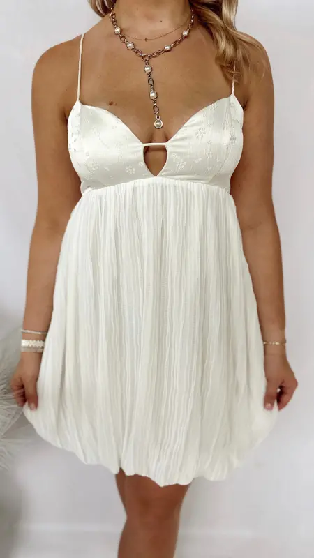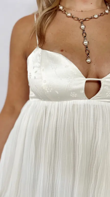 The Gracie Dress is a charming white dress adorned with delicate embroidered flowers, perfect for adding a touch of whimsy to your wardrobe.